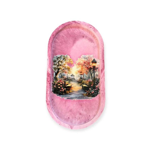Add elegance to your home with this handmade pink marble tray, featuring a romantic garden scene with benches, blooming flowers, and glowing lampposts. Crafted from eco-friendly resin, it’s ideal for organizing accessories, displaying candles, or gifting.