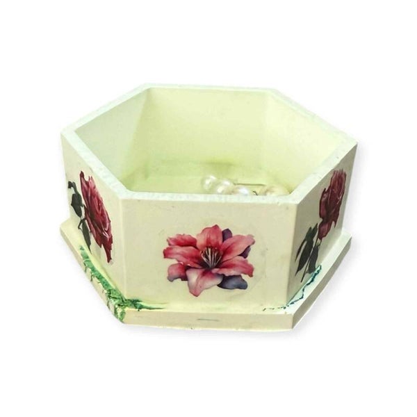 This unique hexagonal trinket box is crafted from eco resin and decorated with vibrant floral designs. Perfect for storing jewelry, rings, or small trinkets, it brings a fresh and artistic touch to your home decor.